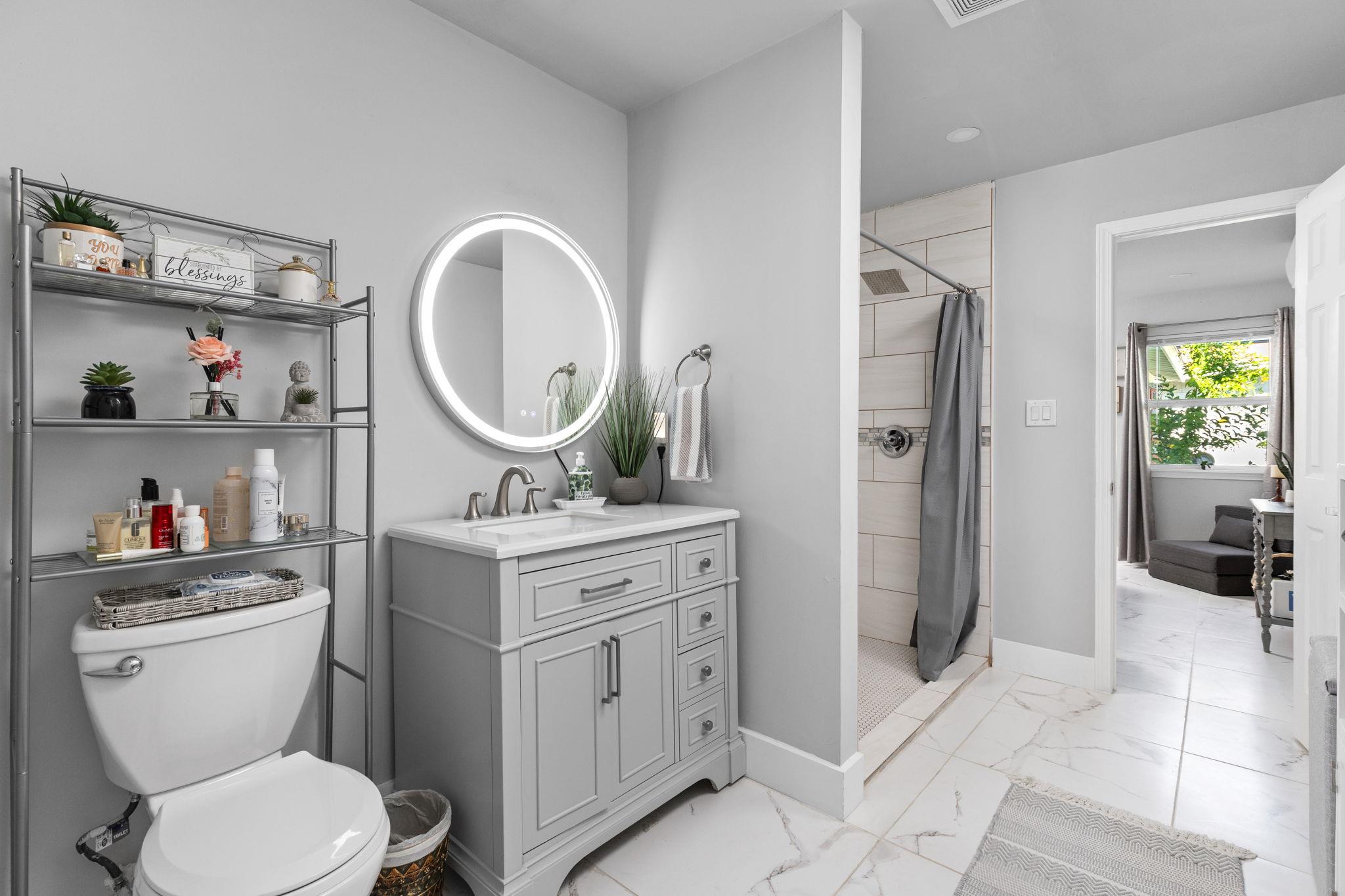 GORGEOUS COMPLETE 2024 REMODEL!!! Rebuilt from the studs in 2024, including updated roof, doors, cabinets, windows, tankless water heater, plumbing, all electrical, electrical box, and spray insulation. This architecturally stunning home is as close to a new build as you can get, and earned recognition from the City of Austin as the 5th most energy-efficient among 100 neighborhood properties. Crisp, clean, and full of natural light. No HOA. Under 10 minutes to downtown, UT, Darrell K Royal Stadium, Austin Community College, and the neighborhood elementary, middle and high schools. This commanding remodel features marble-like tile that flows throughout, and the open-concept design centers around a 10-foot quartz island, where the Cosmo gas range and farmhouse sink handle everything from Tuesday tacos to holiday feasts. The butler's pantry keeps chaos organized. Natural light spills through the windows, while the sprawling living area beckons. Low-maintenance quartz countertops gleam from all corners of the home. The primary suite features a walk-in shower, jetted tub, his-and-hers closets, and a direct connection to the laundry room. The primary suite claims its own wing while two spacious bedrooms anchor the opposite end. Strategic mini-splits replace central air, cutting costs while maintaining maximum comfort. The low-maintenance backyard splits duties: paved fire pit area for entertaining, grass section for dogs, storage shed for Austin living essentials. Everything, including the roof, was replaced in 2024. This home is move-in ready and life-ready!