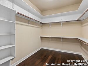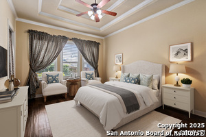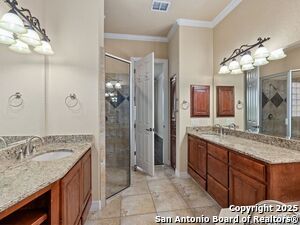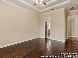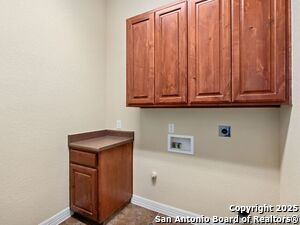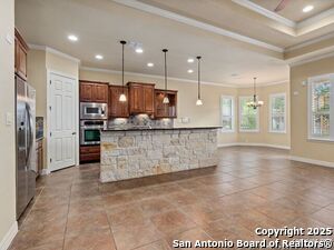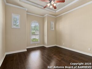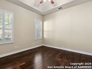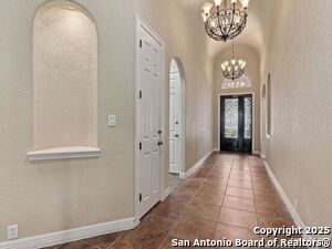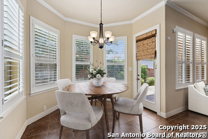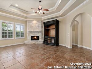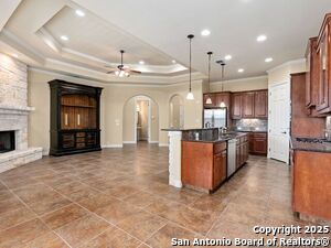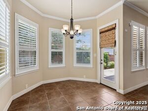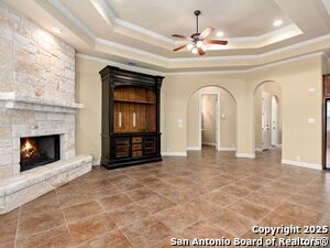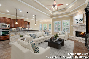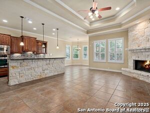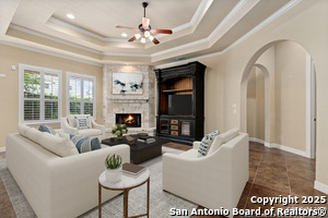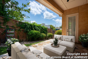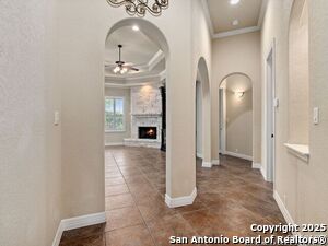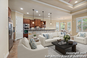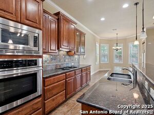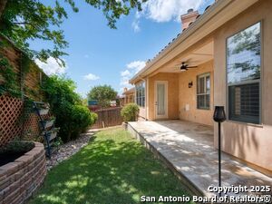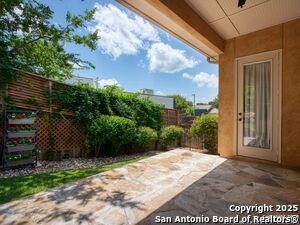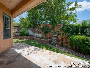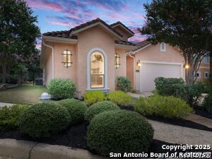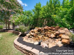 Nestled in a quiet cul-de-sac in the sought-after neighborhood of Huebner Village, this beautifully maintained 3-bedroom, 2.5-bath custom home by McNair Custom Homes combines timeless elegance with modern convenience. All in a prime central location in San Antonio. Step inside to discover a grand 13-foot barrel-vaulted ceiling in the entryway, a striking floor-to-ceiling stone gas fireplace, and rich wood flooring in all bedrooms. The open-concept layout flows effortlessly into a gourmet island kitchen, featuring granite countertops, Alder wood cabinetry, stainless steel appliances, under-cabinet lighting, and custom finishes throughout. The spacious laundry room offers added functionality with a built-in sink and extra storage, while plantation shutters add style and privacy throughout the home. Outside, your private oasis awaits. A tranquil 10-foot moss rock waterfall, a tropical flagstone patio, a covered porch, and a serene fountain feature perfect for both quiet mornings and evening gatherings anchor the professionally landscaped backyard.
